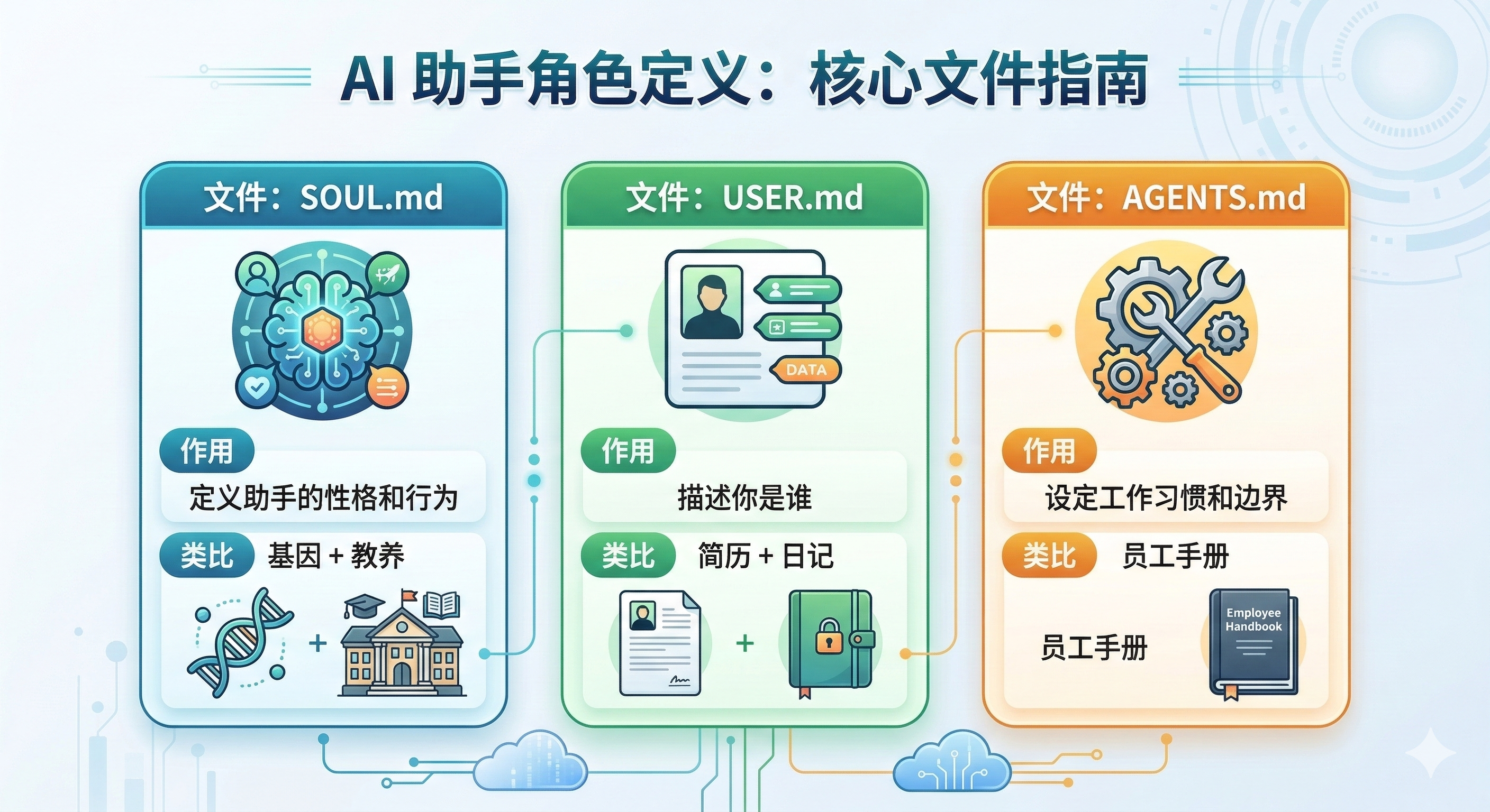 - 灵魂三件套:SOUL.md(性格基因)+ USER.md(认识你)+ AGENTS.md(工作手册)
